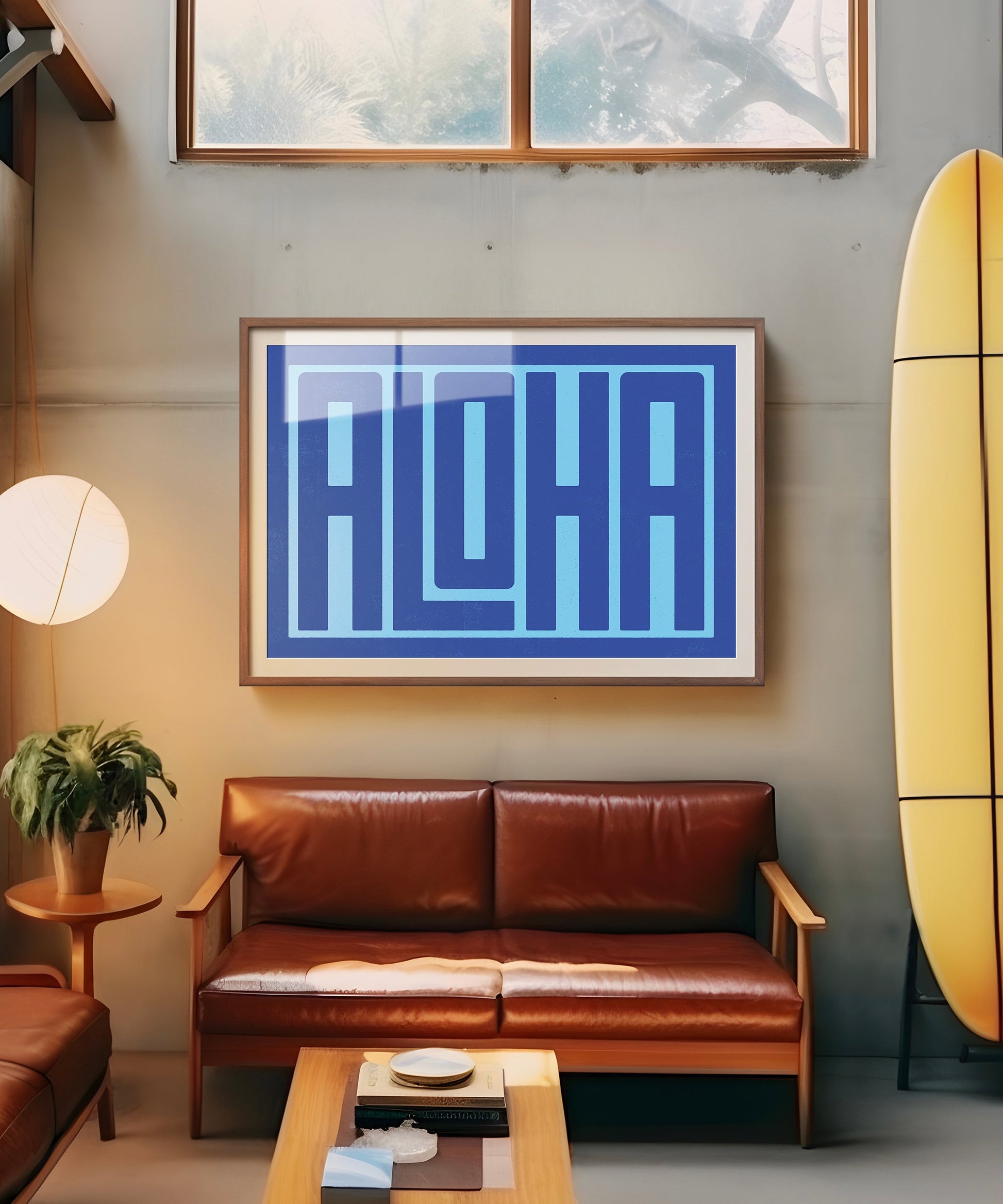 This "Aloha" typography print is our modern take on the timeless Hawaiian expression. Make a bold statement in your entryway, living room, or kitchen by displaying this striking piece, perfect for both greeting your guests and saying goodbye to them!