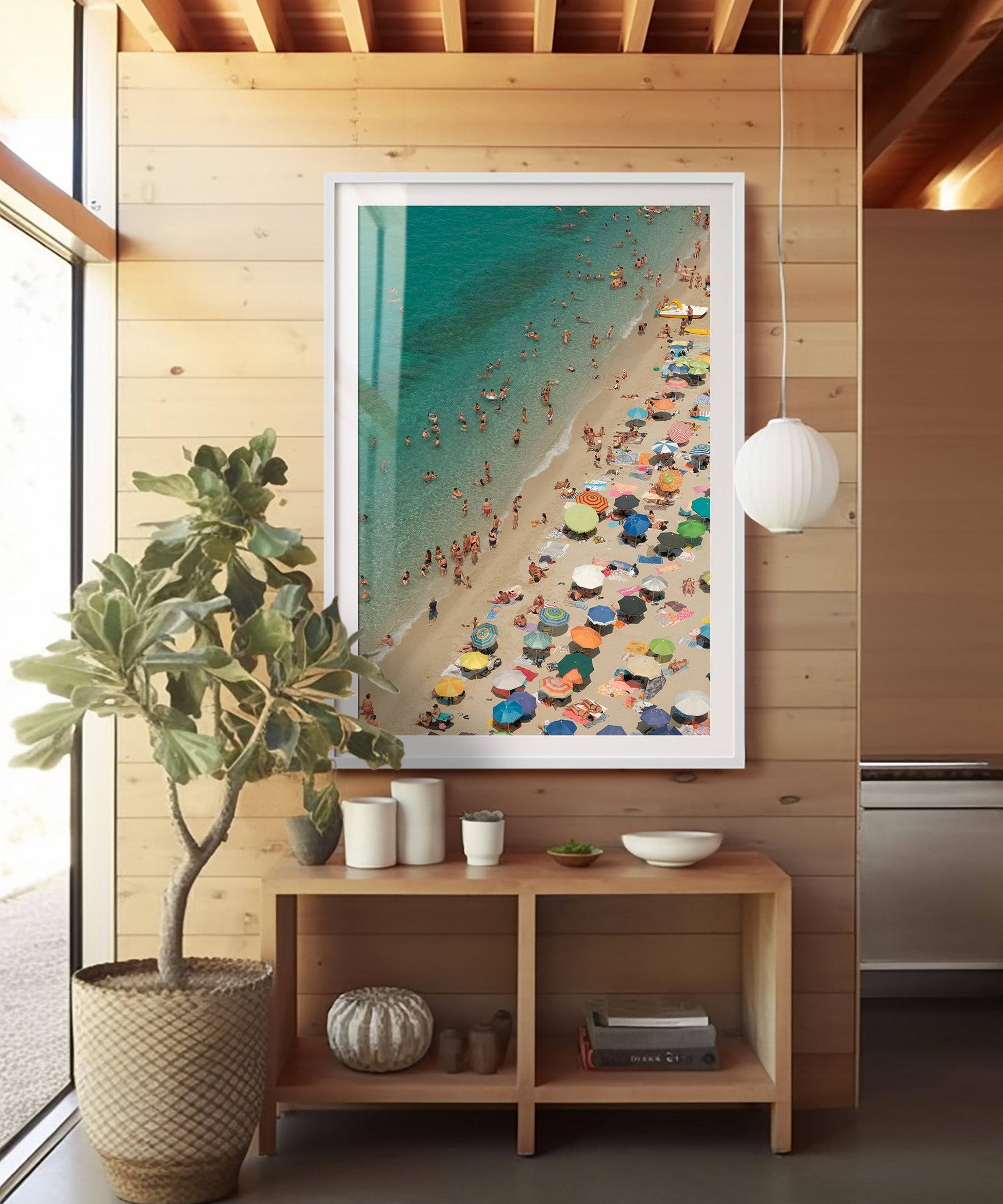 This striking photo of the Amalfi Coast showcases the stark divide between the white sand beach and vivid blue waters. Just like a "Where's Waldo" illustration, this photo is packed with intriguing details for your eyes to discover. Not only will this print add a beautiful touch to your space, but also provide endless enjoyment as you and your guests explore the diverse crowd of beachgoers.
