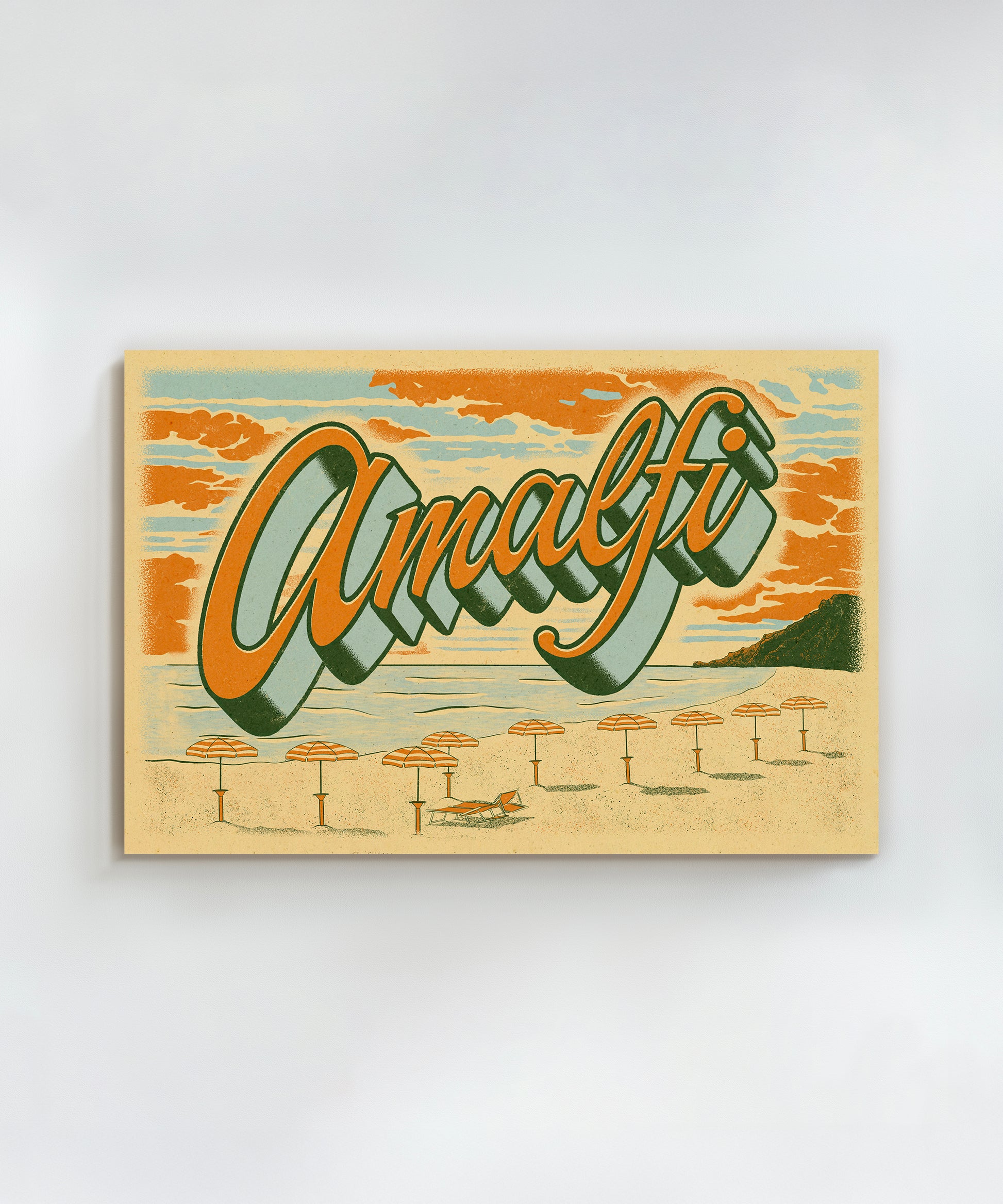 The vintage charm of the Amalfi Coast comes to life in this piece, inspired by classic travel posters and postcards. Featuring Amalfi's iconic beach umbrellas, this print captures its nostalgic appeal through textures and colors reminiscent of traditional printing techniques. Hang it in your space to transport yourself to the timeless Italian coast, where you can bask in the sun and sip on an Aperol Spritz.