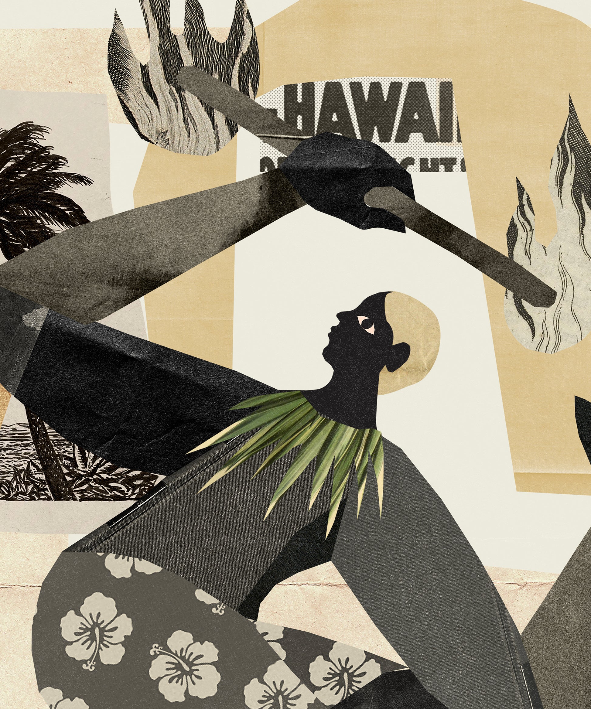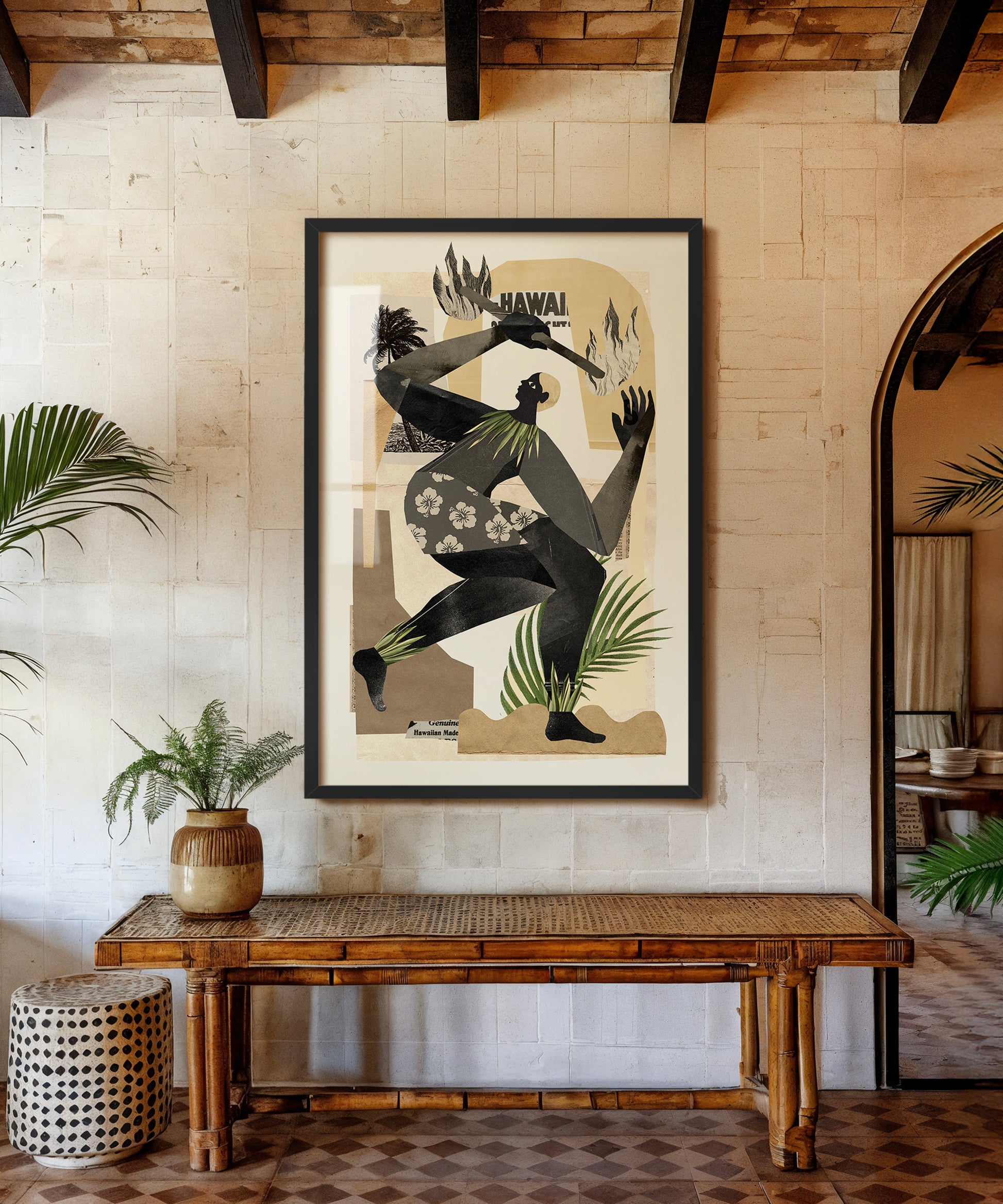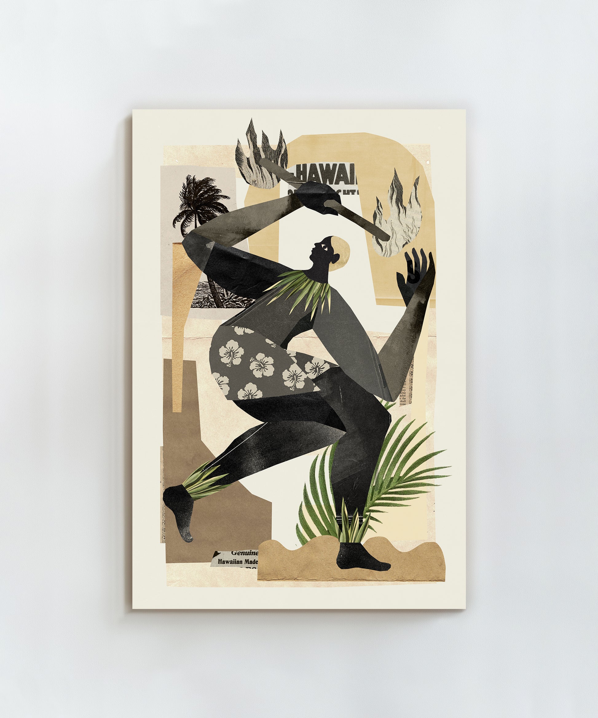 This striking collage captures the rhythm and ritual of a classic Hawaiian fire dancer. Part of our Coastal Collage Series, this piece is built from vintage coastal images and textures. Packed with character, it's a bold nod to island tradition reimagined in modern form. Display him solo for a statement piece, or pair him with his hula-dancing counterpart for the perfect duo on your wall.