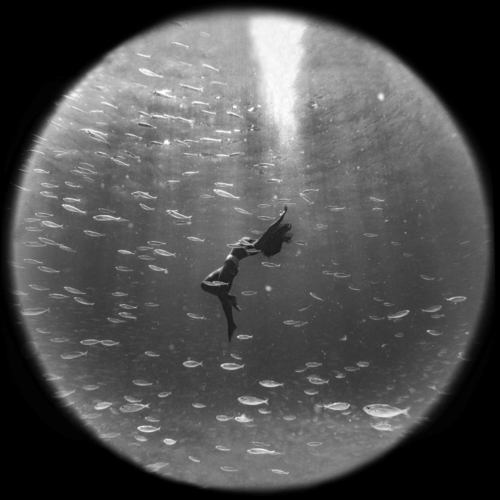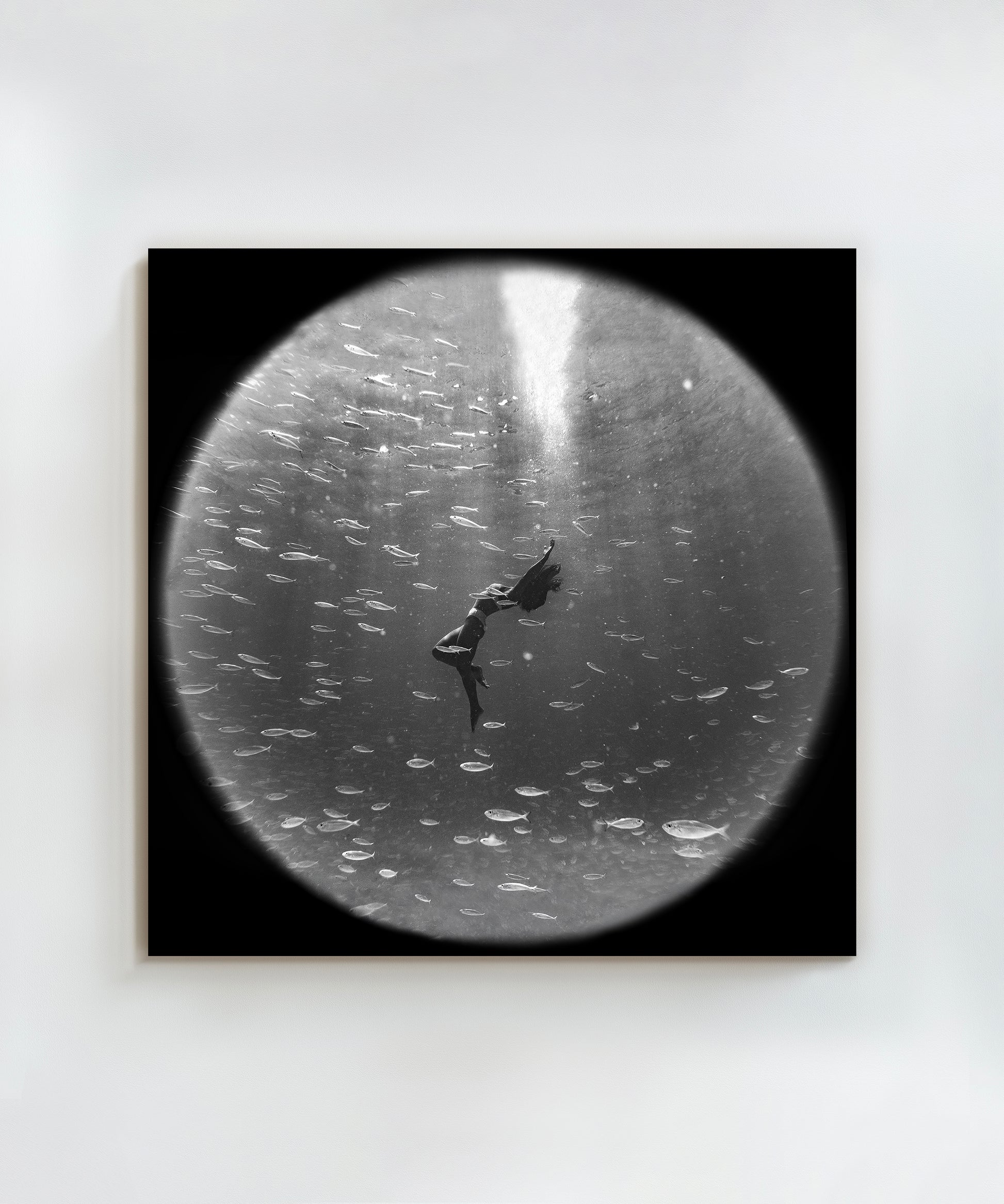 Dive into a surreal underwater world with Benjamin Ono’s Encircled. Captured with a circular fisheye lens, this perfectly timed shot creates a bubble-like illusion where a lone woman drifts at the center of a swirling school of silver fish. Dreamy and immersive, Encircled pulls you beneath the surface and makes a serene and striking statement on your walls.