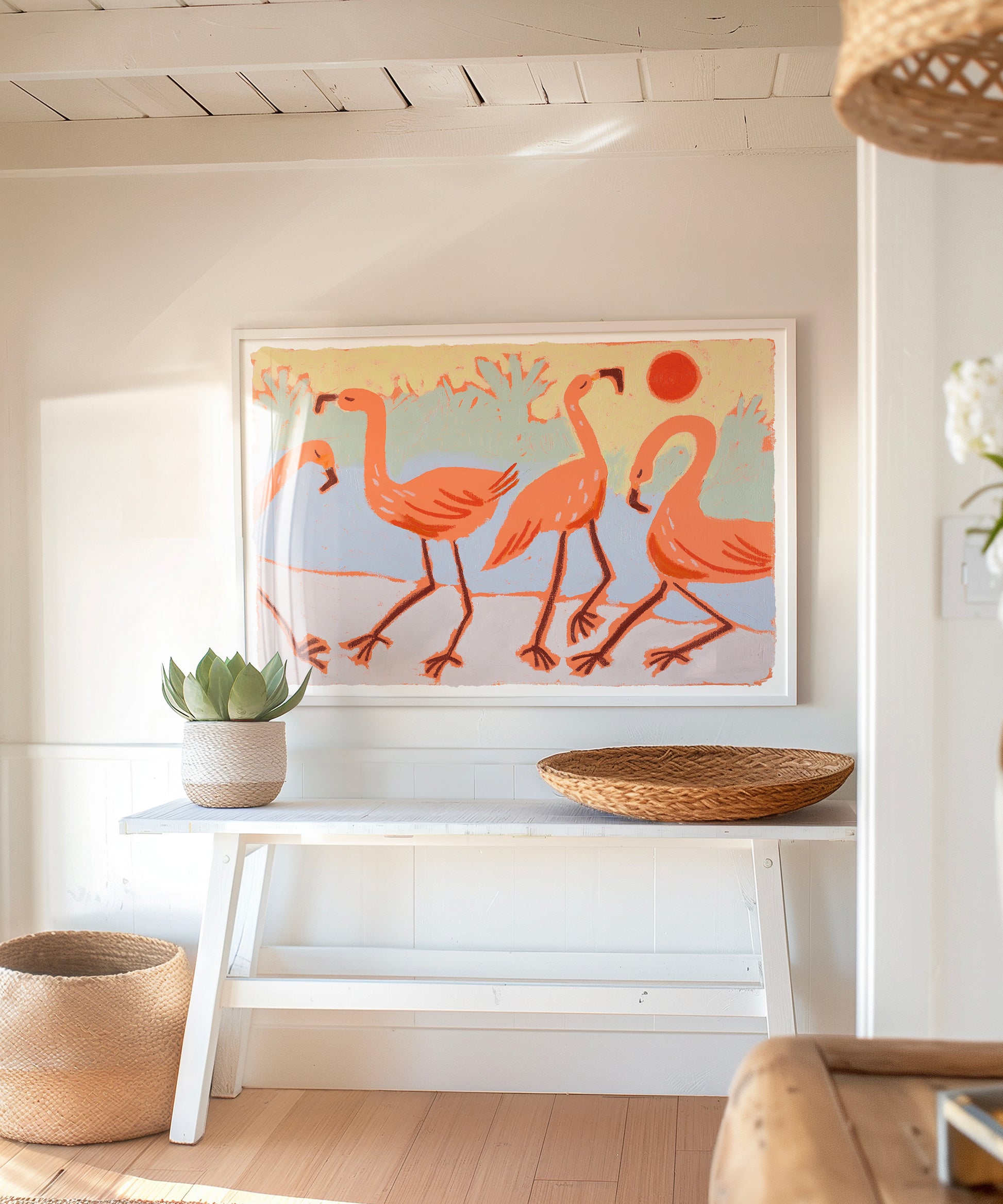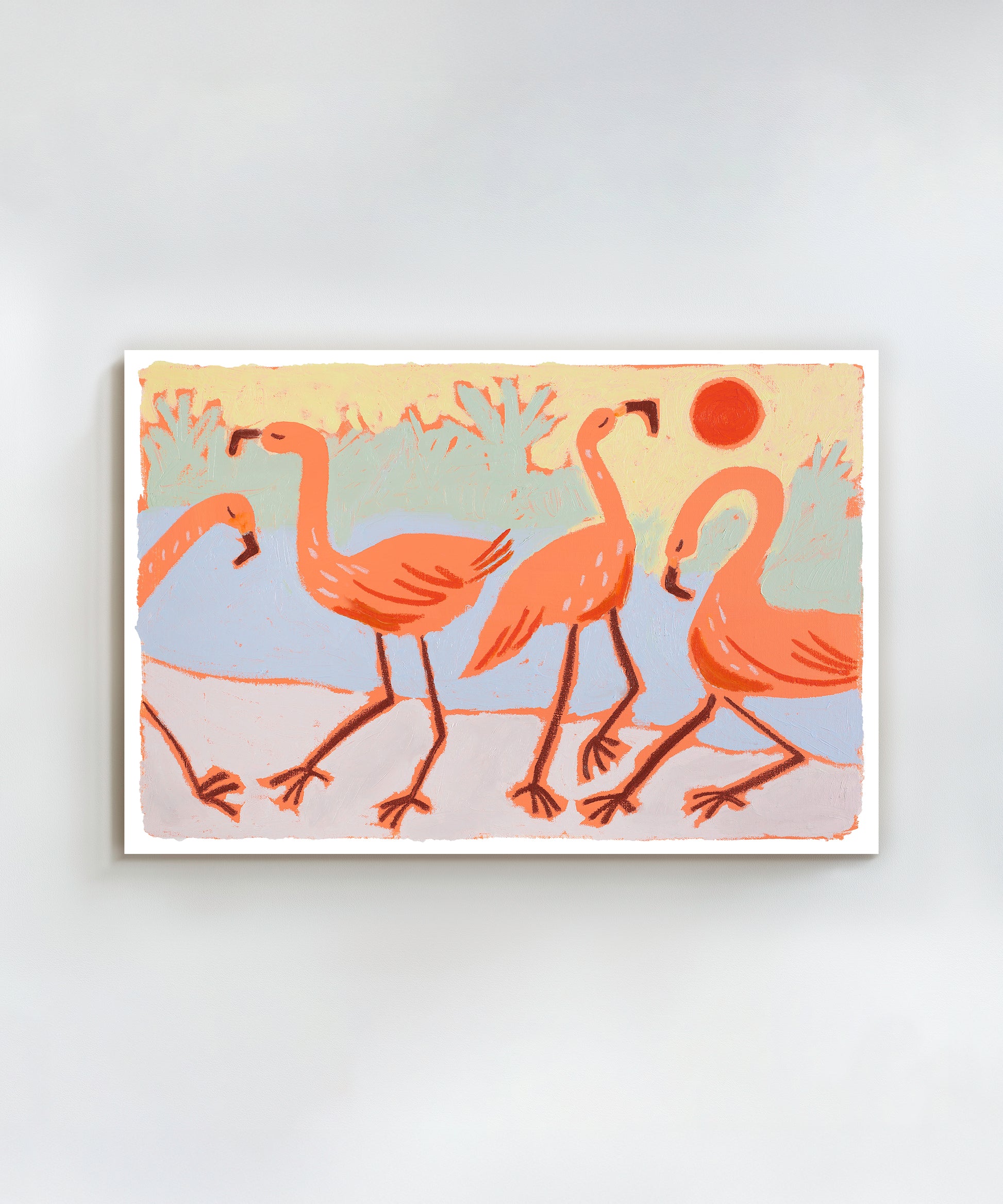 Brilliant pink flamingos await to adorn your walls in this charming piece by Melissa Lakey. With soft pastels and rich textures, it adds the perfect pop of color to spaces with a clean coastal aesthetic. Whether displayed in a living room, bedroom, or nursery, this piece is sure to capture your heart once it's up on your walls.