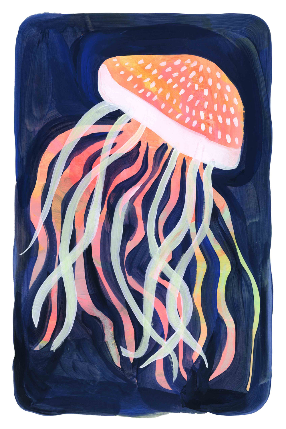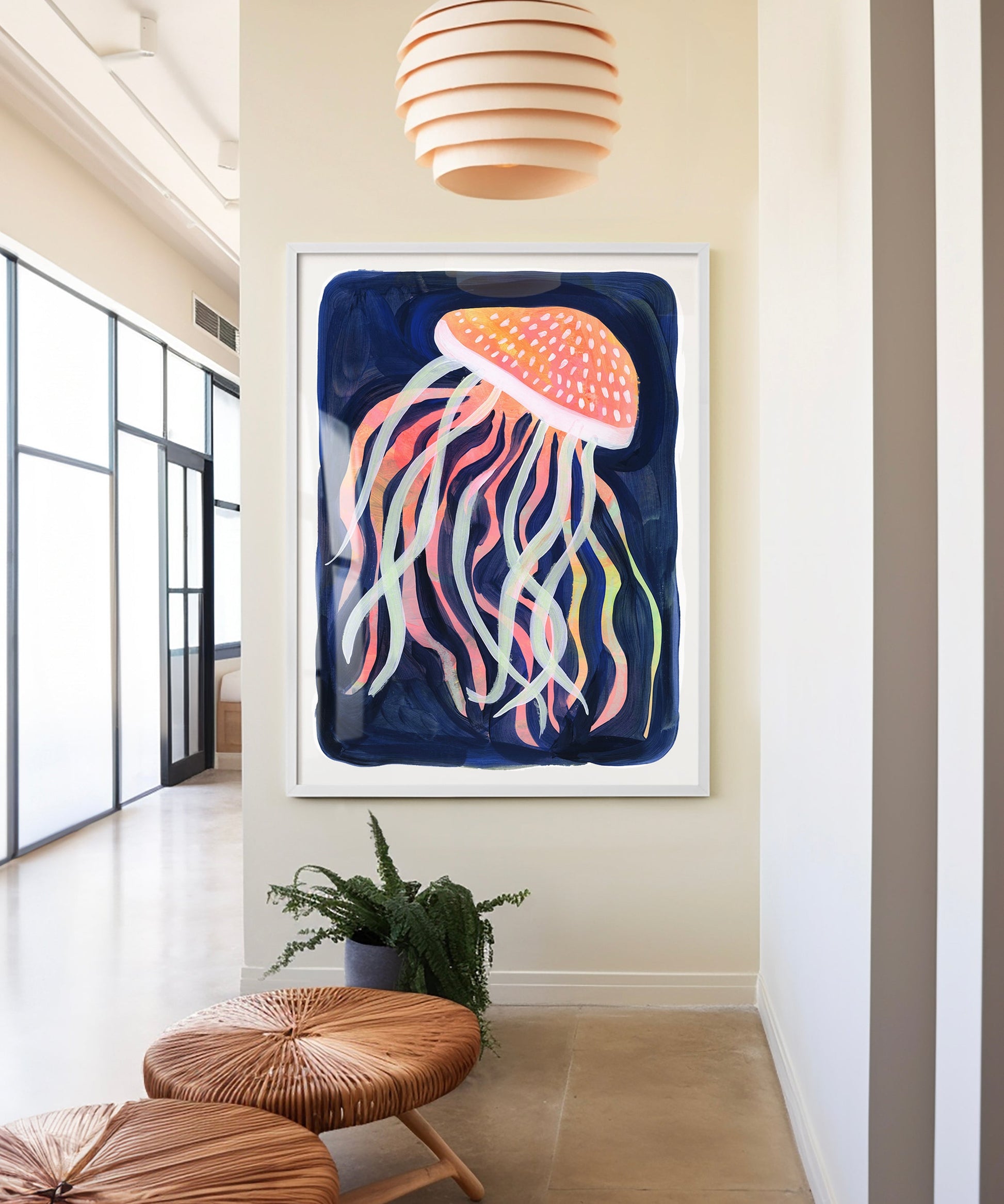 This vibrant print entitled "Floating in the Waves" is print #1 of 4 in our colorful coastal collection by Melissa Lakey. Featuring a colorful jellyfish with streaking tentacles, this piece is perfect for a splash of color in a nursery or kid's room!