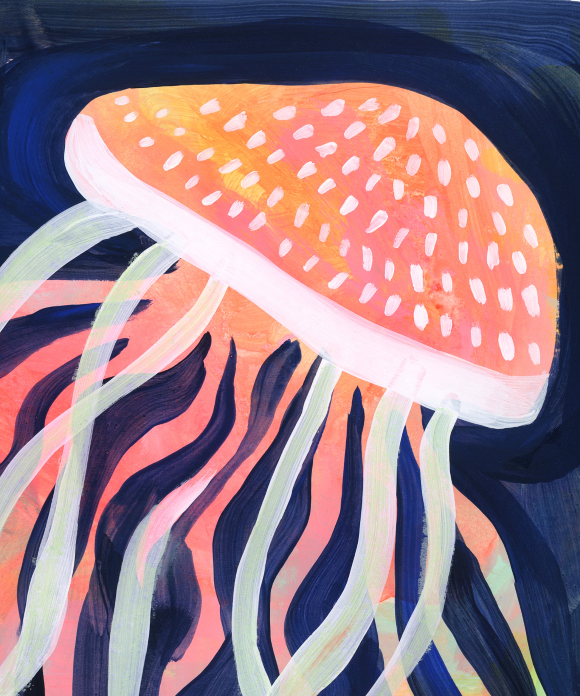 This vibrant print entitled "Floating in the Waves" is print #1 of 4 in our colorful coastal collection by Melissa Lakey. Featuring a colorful jellyfish with streaking tentacles, this piece is perfect for a splash of color in a nursery or kid's room!Â