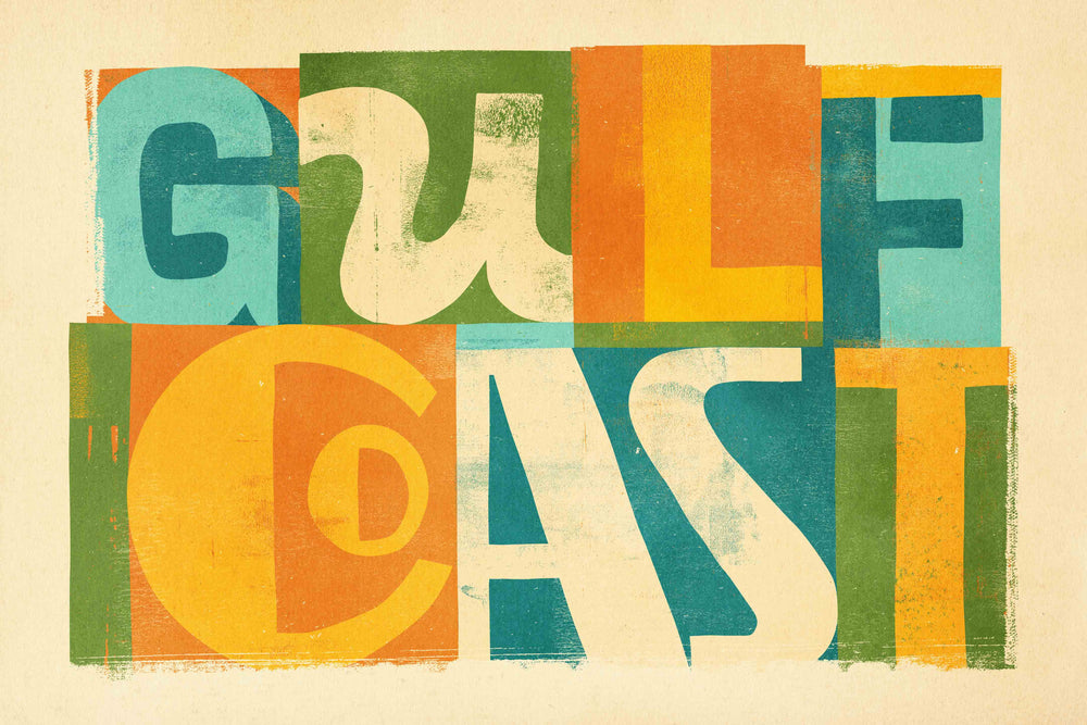Bring the laid back Gulf Coast mindset to your space with this vibrant custom typography piece! With textures and colors that capture the essence of the region, this print will be at home from Texas down to the Florida Keys. Whether you're originally from the area or currently live in the region, this piece is perfect for those who love sand between their toes and the coastal breeze in their hair.