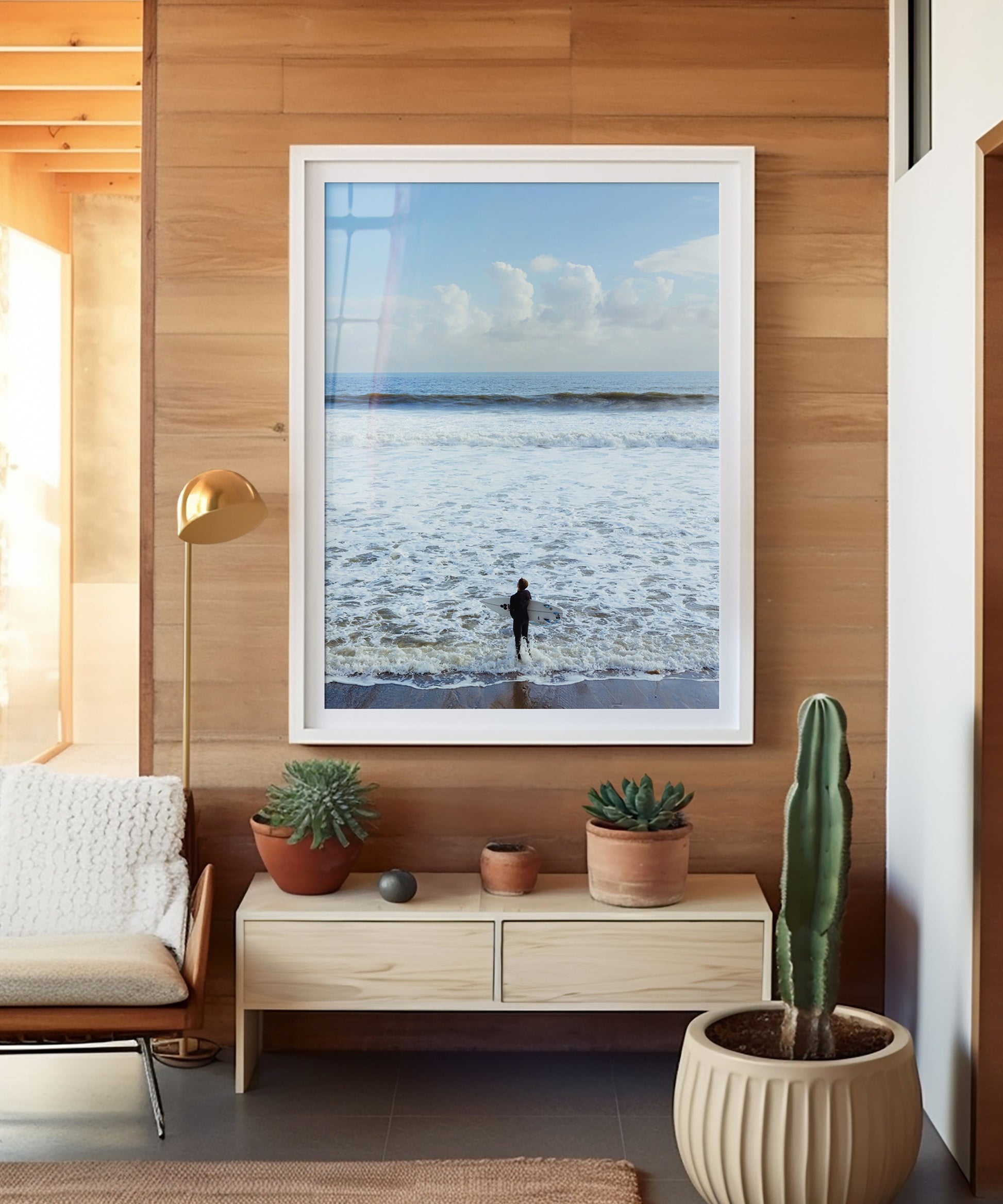 This photo is print #3 in a stunning 8-print collection by Santa Barbara based photographer Alex Noble. Noble has an eye for capturing simple yet stunning compositions on his native coast of California. This shot, entitled, "Into the Surf," captures a surfer preparing themselves just before they head out into the water.