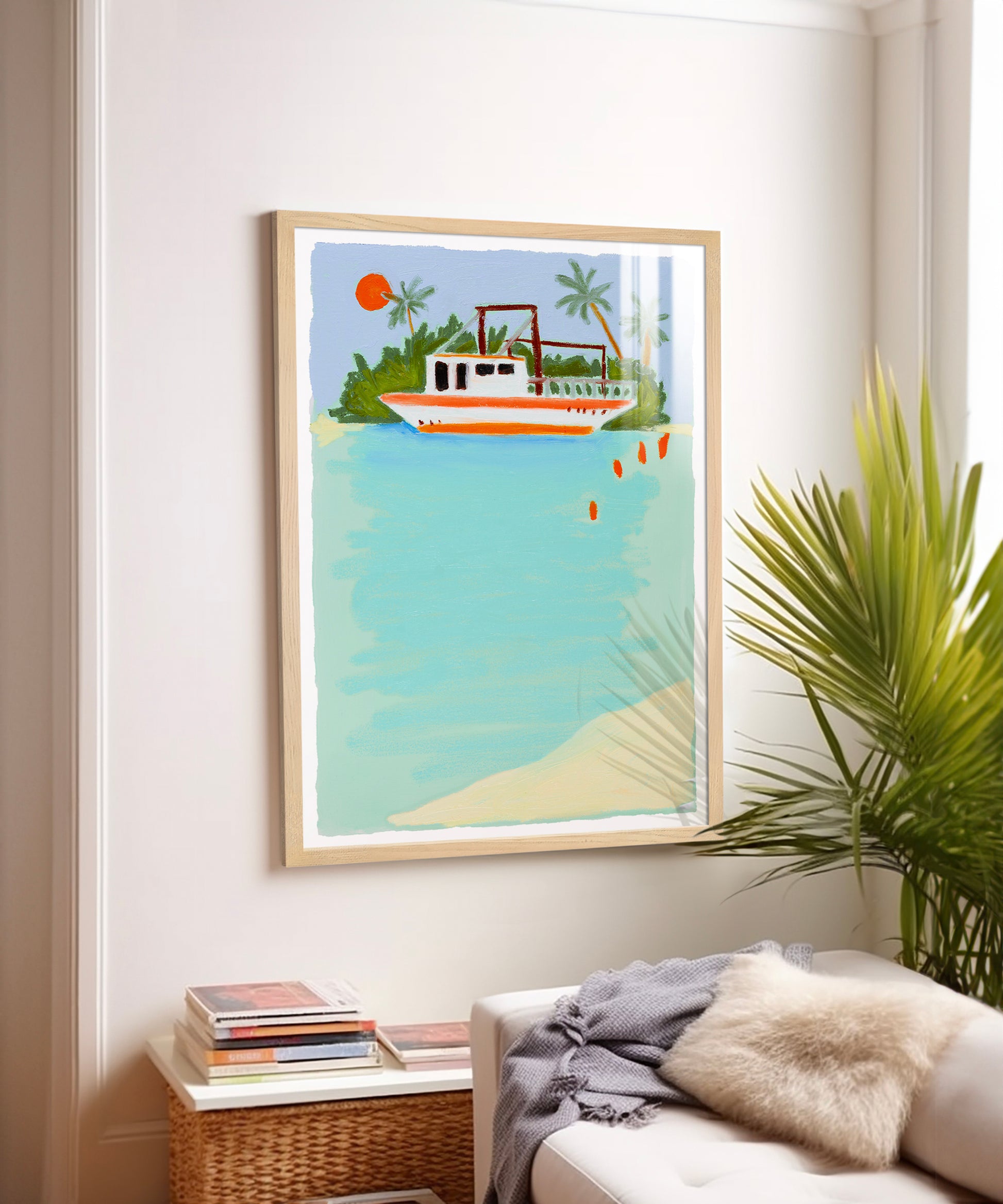 One of four playful boat-themed pieces by Melissa Lakey, "Just Offshore" captures the vivid colors of a day on the Gulf Coast. A perfect addition to any space with soft coastal tones, this piece brings charm wherever it goes. Pair it with one of her three other boat-themed works for a beautiful addition of pastel pieces.