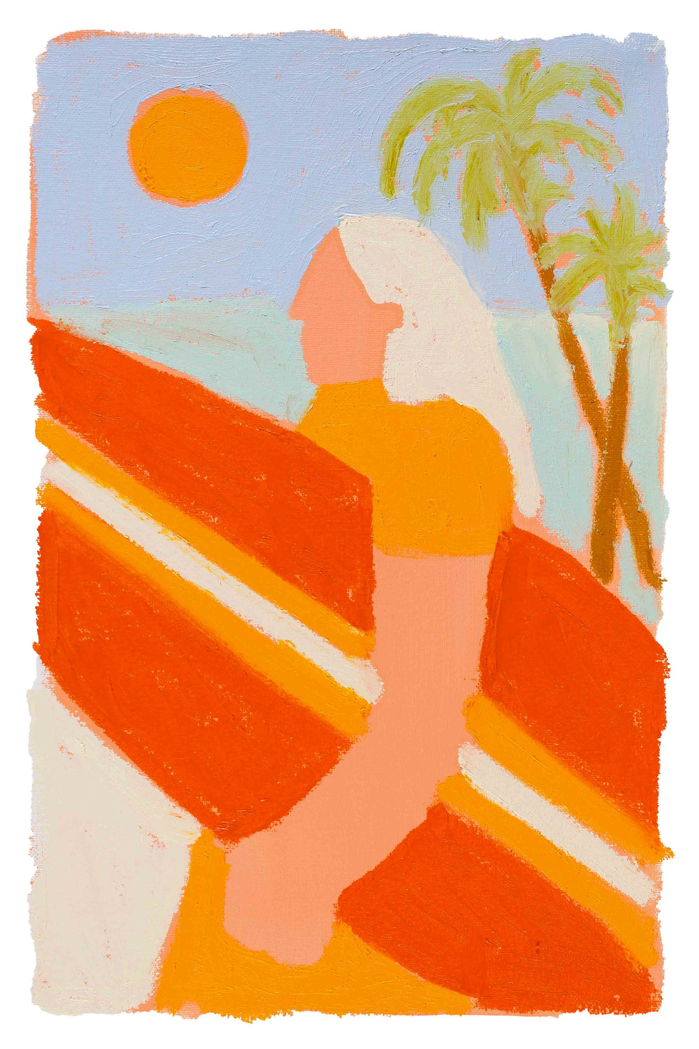 This vibrant piece by Melissa Lakey captures the carefree energy of a surfer heading toward the ocean, surfboard in hand and adventure on the horizon. Originally created with oil sticks on canvas, this artwork's minimalistic style brings a modern coastal feel to any space. One of two surfer girl prints by Lakey, it pairs beautifully with "Surf and Sunshine," but also stands out effortlessly on its own. Perfect for a beach house, living room, or playful nursery, this piece brings the simple joy of a sunny beach day into your space.