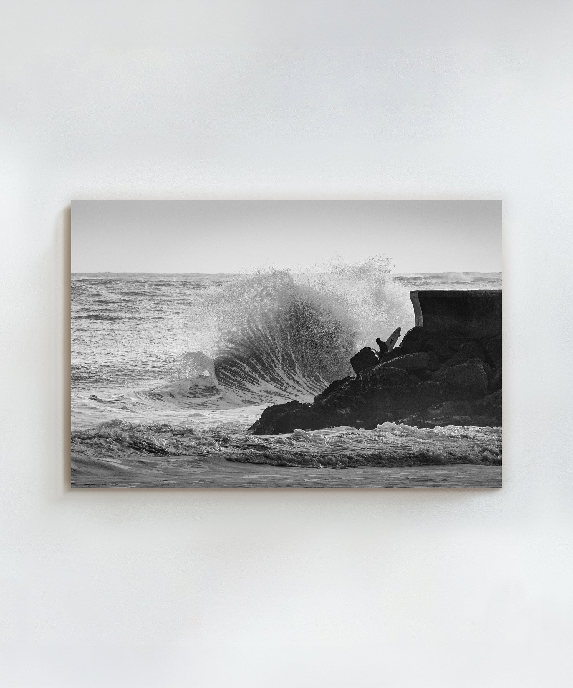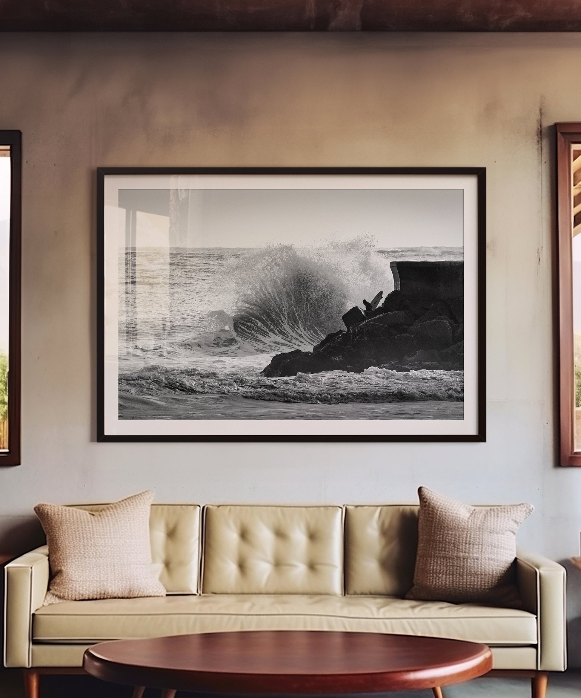 This photo is print #1 in a stunning 8-print collection by Santa Barbara based photographer Alex Noble. Noble has an eye for capturing simple yet stunning compositions on his native coast of California. This perfectly-timed black and white shot entitled, "On the Rocks," shows a surfer braving the treacherous stretch of jagged rocks in order to reach the perfect wave.