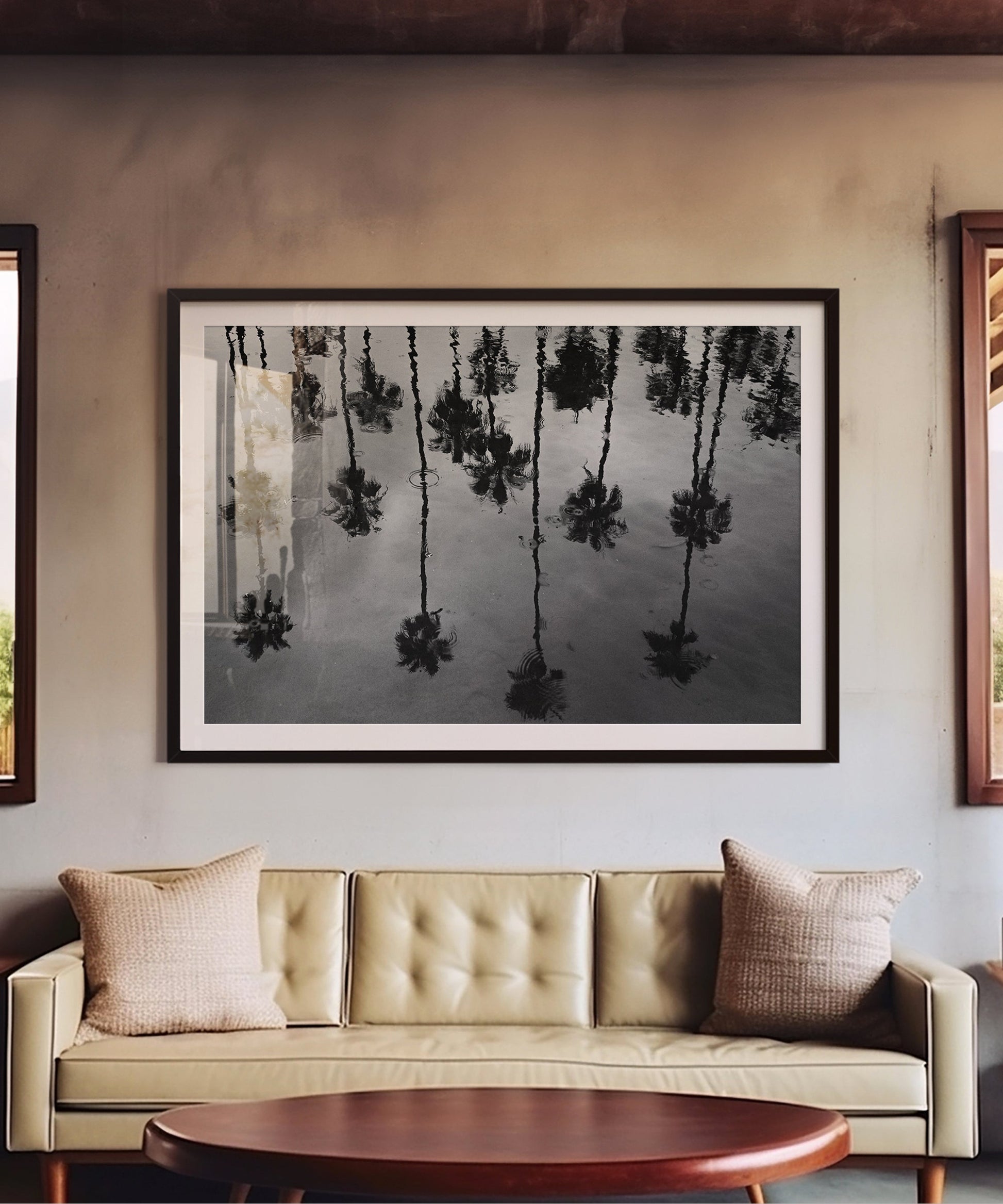 This piece is print #7 in a stunning 8-print collection by Santa Barbara based photographer Alex Noble. Noble has an eye for capturing simple yet stunning compositions on the coast of California, like this beautiful black and white shot that shows a row of palms in the water's reflection on a rainy day.