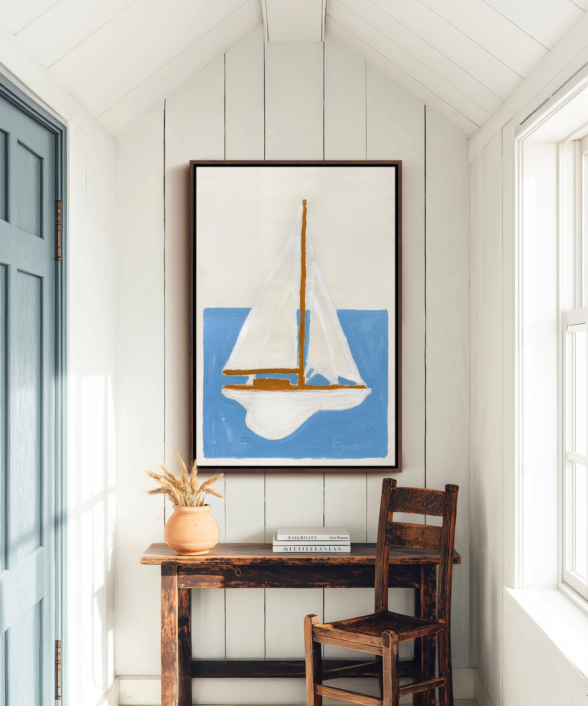 A simple yet timeless piece, "Sailboat #4" by Anne-Louise Ewen brings effortless coastal charm to your space. Painted with bold brushstrokes and a minimalistic palette on raw canvas, its simplicity is exactly what gives it such elegance. For a perfectly curated coastal cottage aesthetic, pair this piece with Ewen's "Lifeguard Tower" and "Lobster" to complete the trio.