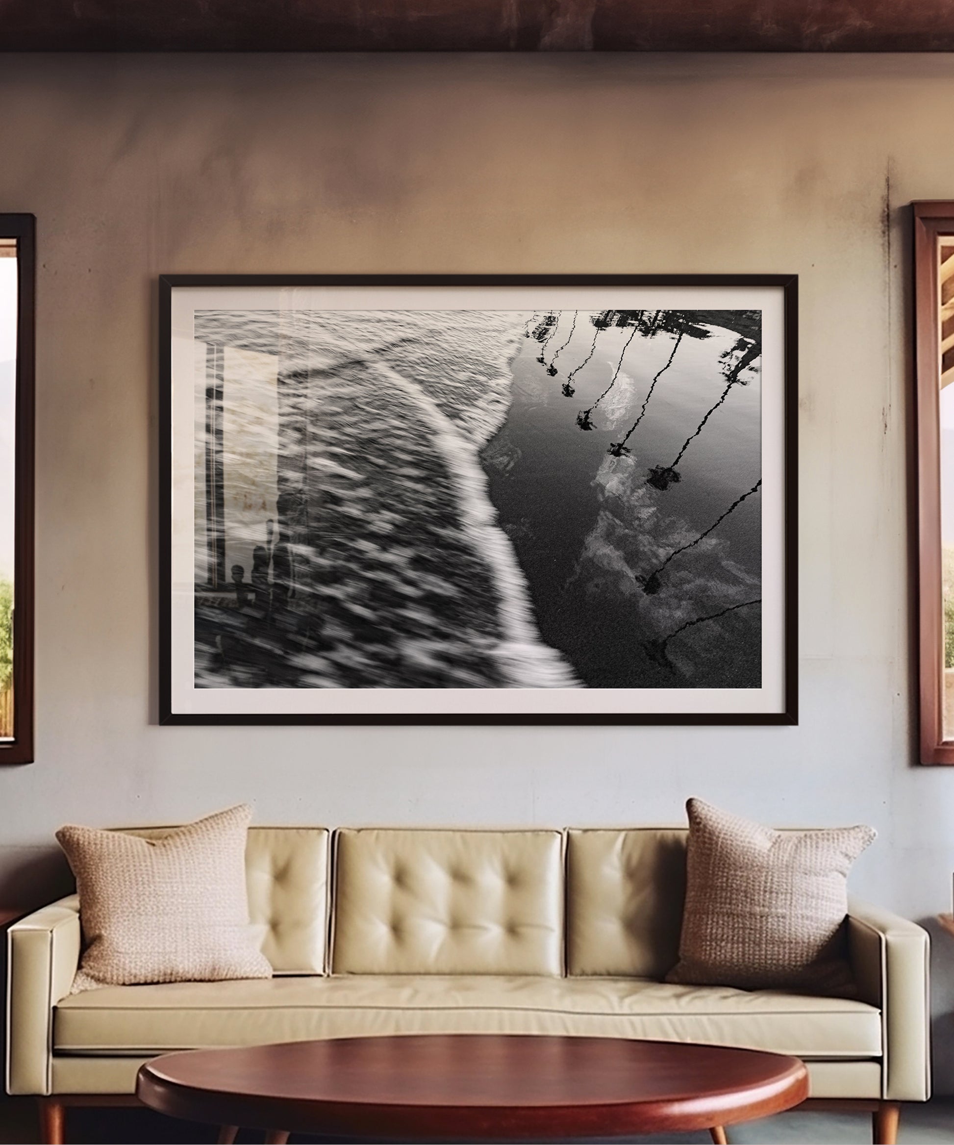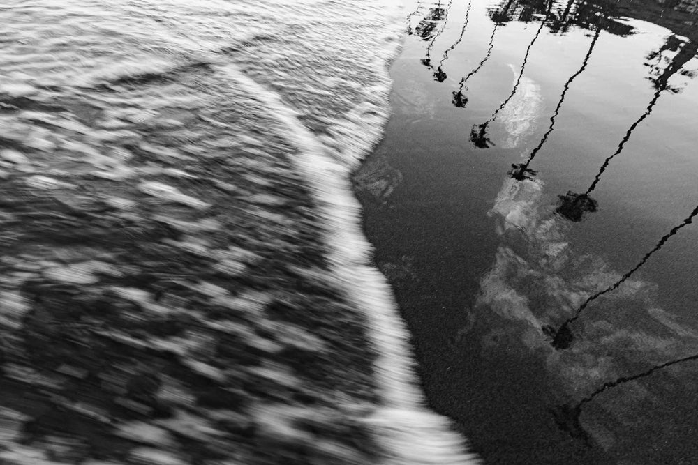 This piece is print #8 in a stunning 8-print collection by Santa Barbara based photographer Alex Noble. Noble has an eye for capturing simple yet stunning compositions on the coast of California, like this unique shot of the shoreline with palm trees visible in the water's reflection.