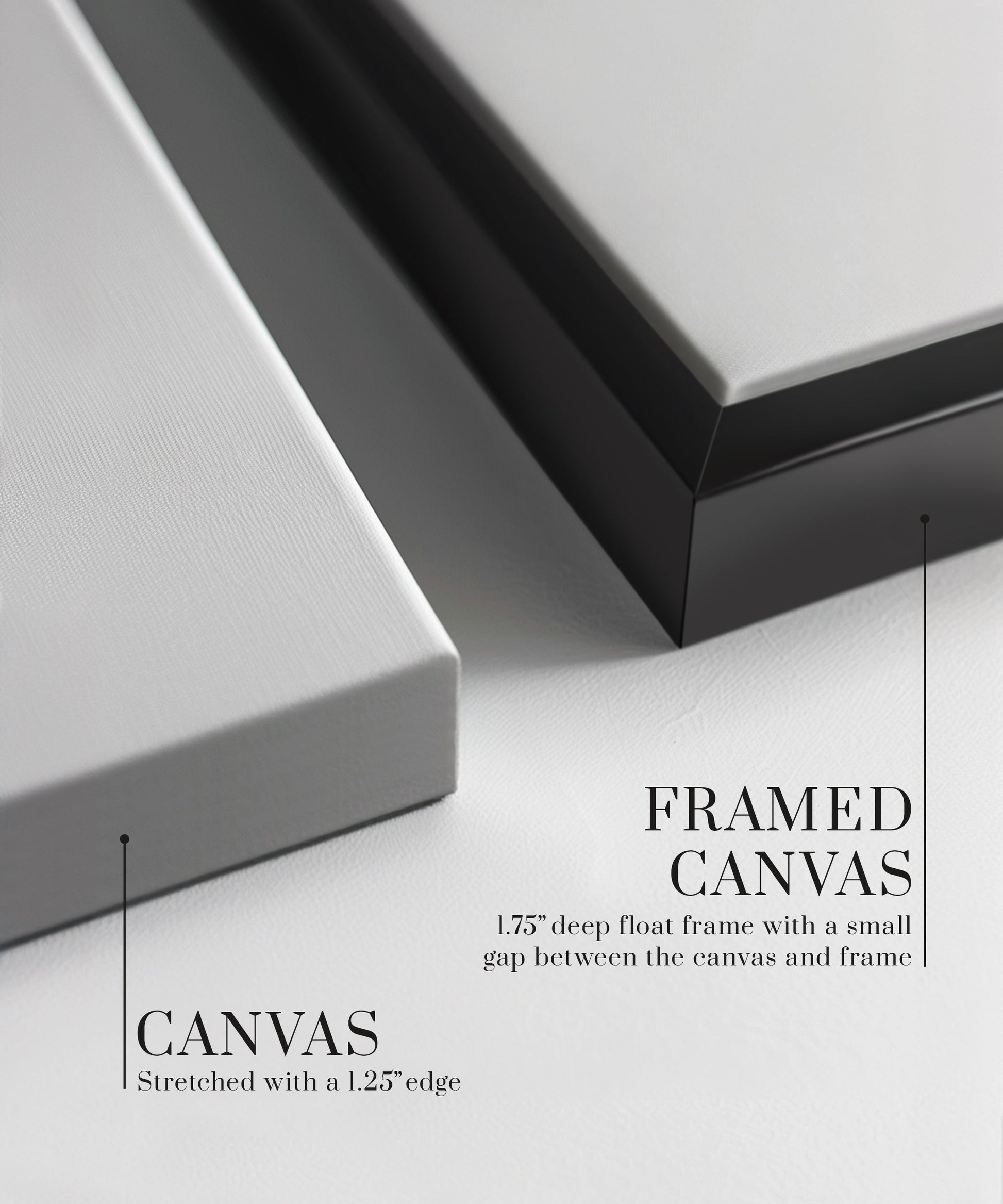 Our framed canvas option comes float framed with a small gap between the edge of the canvas and the frame. The depth of the frame is 1.75" and the width of the frame is .75".