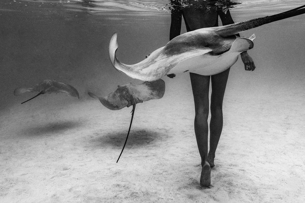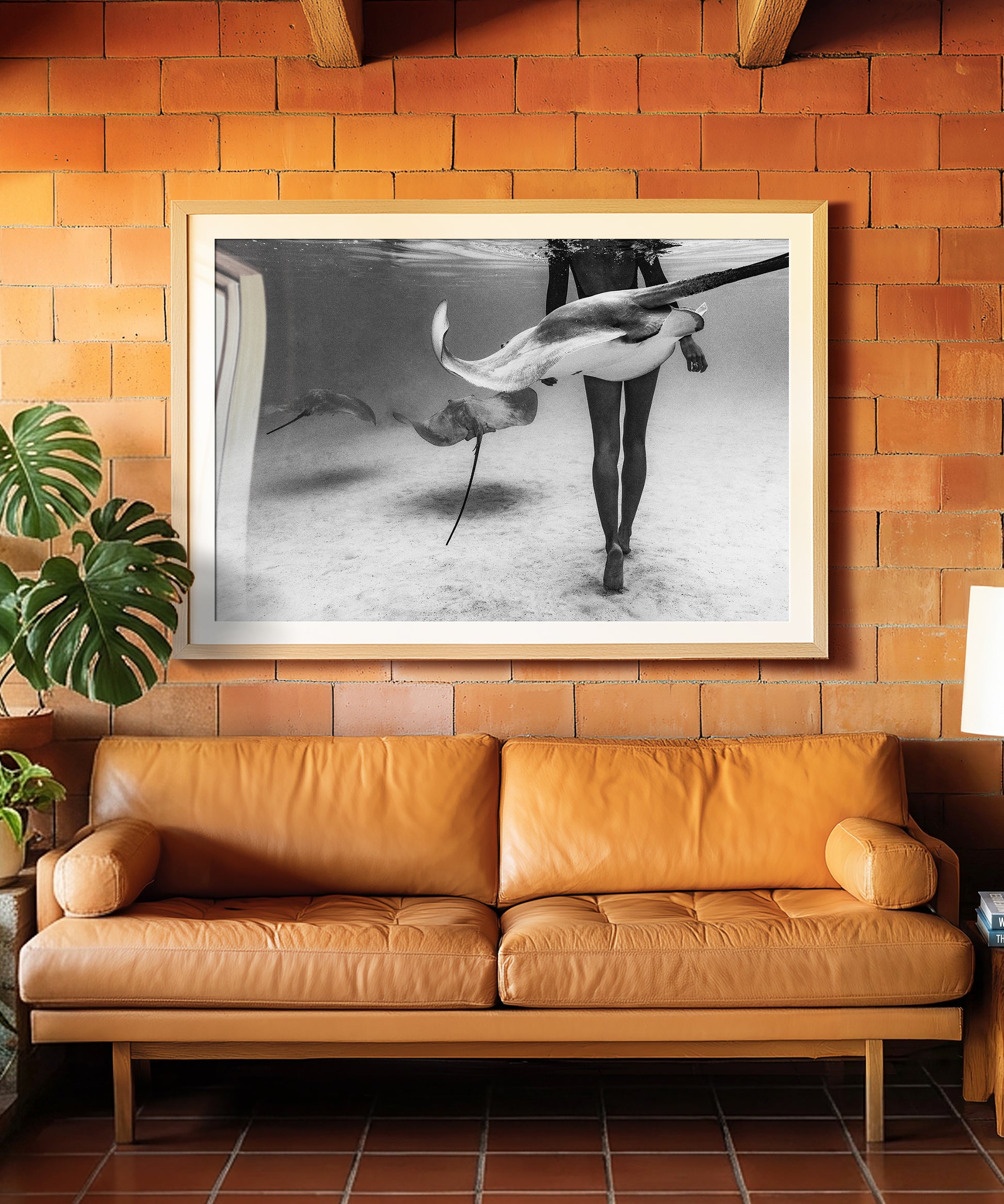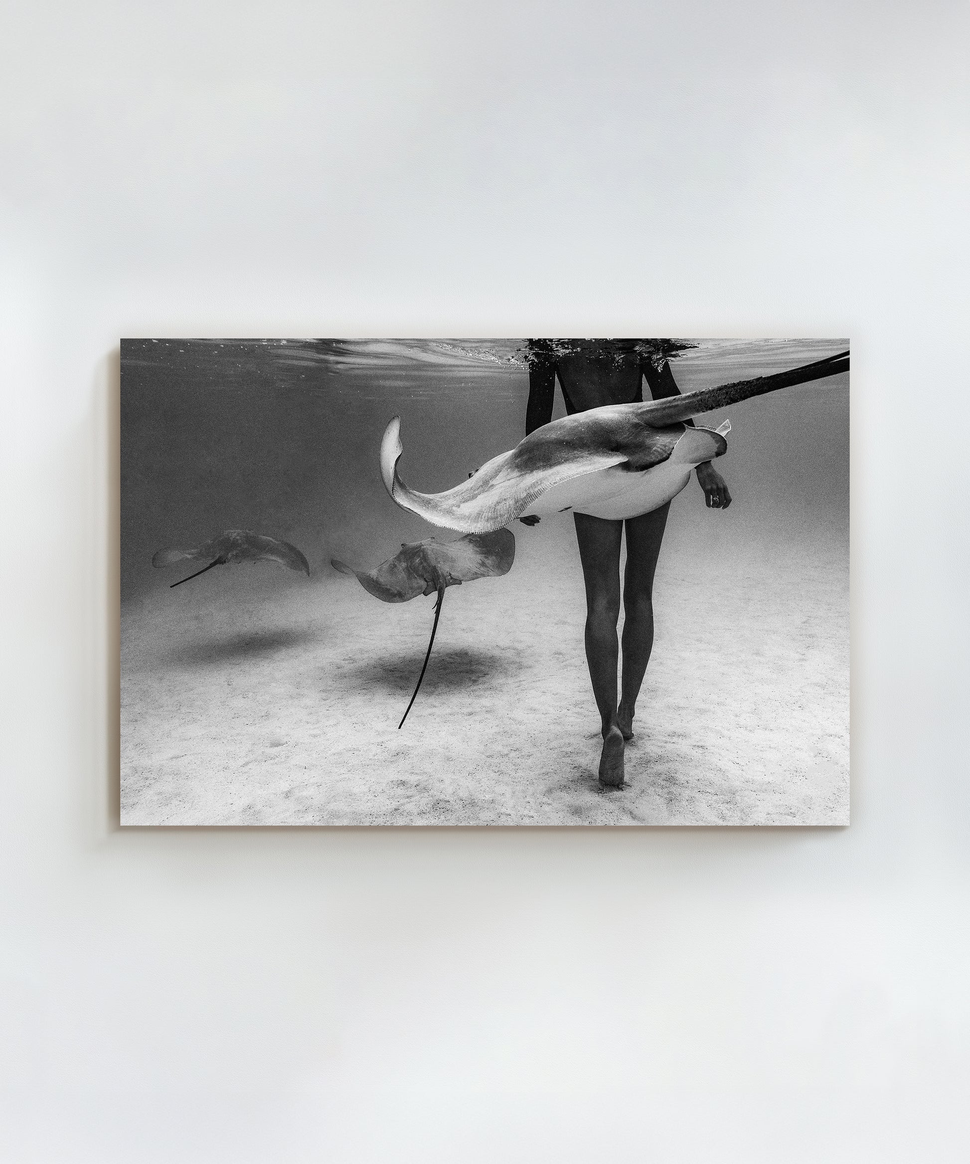 An underwater snapshot that’s equal parts serene and electric. Stinger by Benjamin Ono captures the moment a stingray slices through the water past a woman's legs. Simple, sexy, and quietly mesmerizing, this piece brings a clean touch of coastal magic to any space.