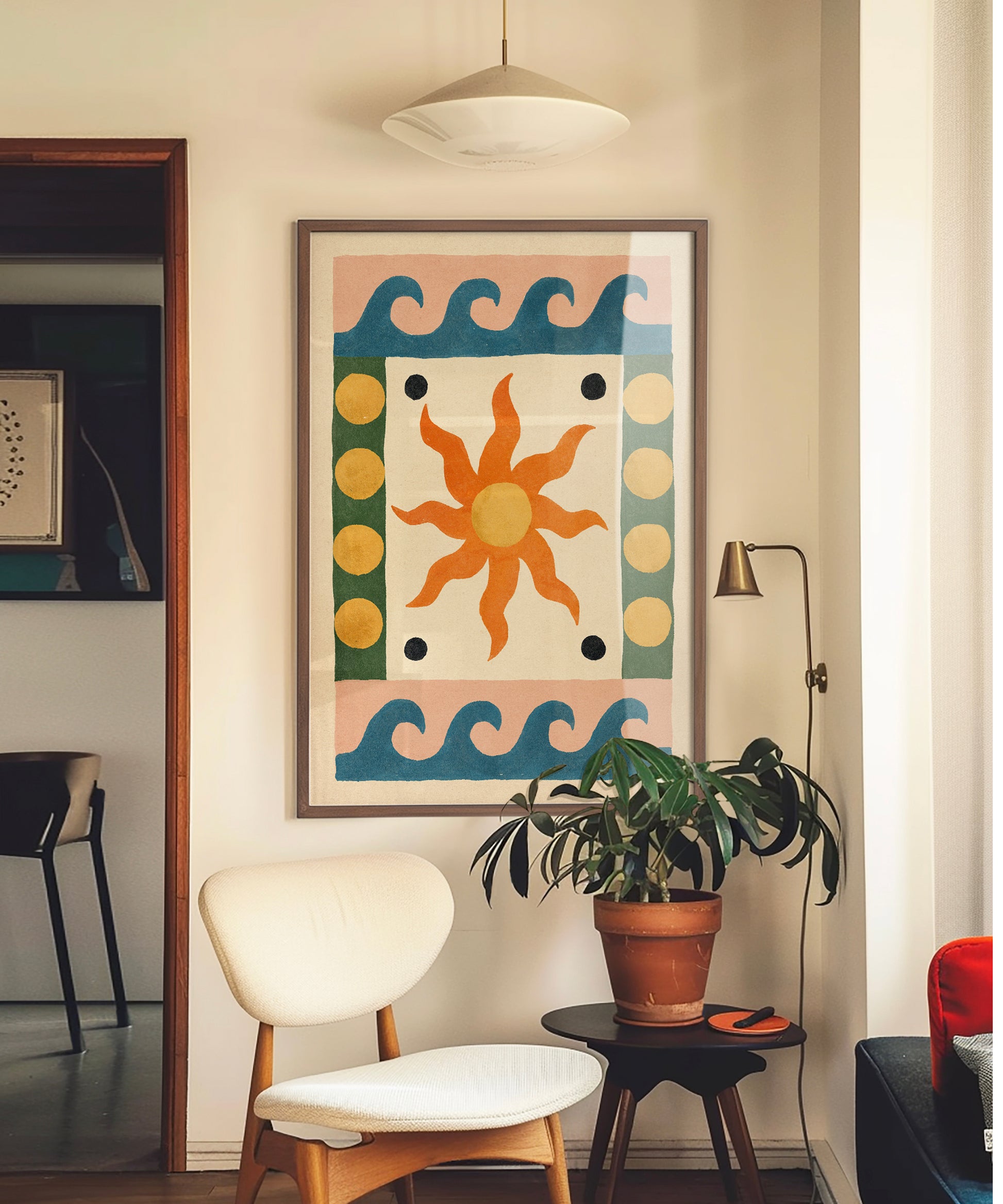 This colorful patterned piece is print #3 in our Sun and Waves Series - a collection of prints dedicated to the two most important parts of the coast. Inspired by coastal tapestries in both it's design and texture, this print is perfect for anyone looking to add a minimalist yet sophisticated touch to their coastal space. Pair this piece with any of the others in this series to create the perfect collection or gallery wall!