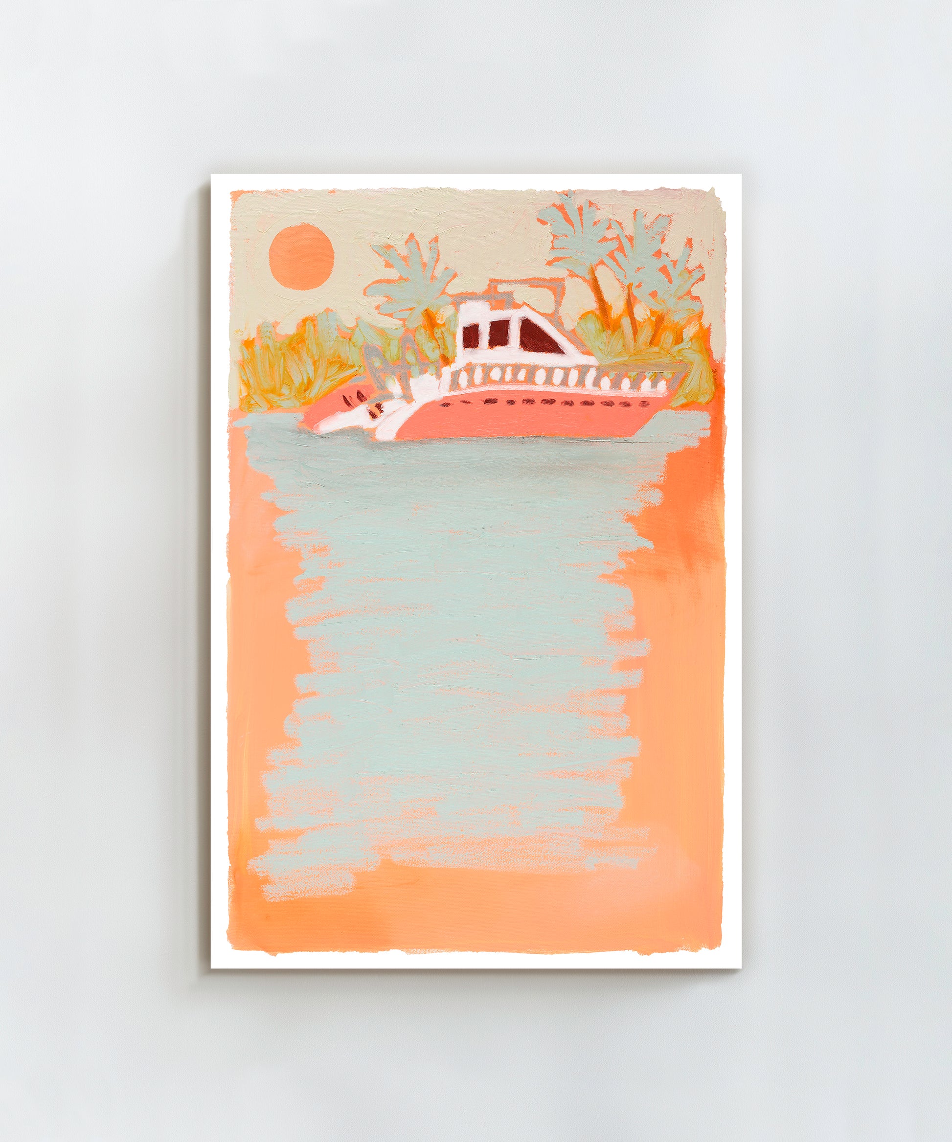 Melissa Lakey uses charming pastels to capture the warm orange hues of a sunset in her piece, "Sunset Cruise." Originally created with oil sticks on canvas, this artwork features rich textures and character throughout. Pair it with one of her three other boat-themed pieces for the perfect pop of color in your bright and sunny space.