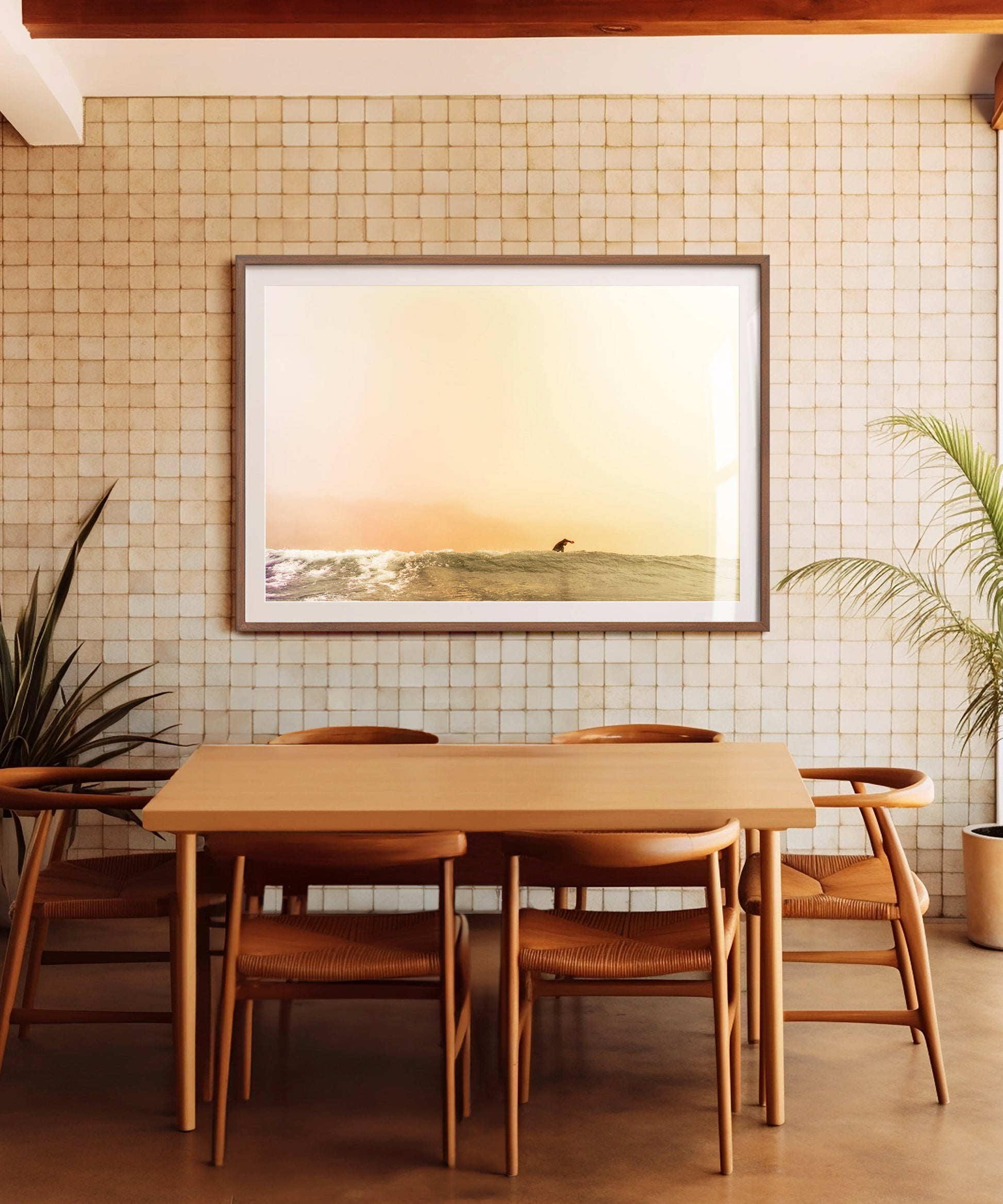 This piece is #1 in Ben Christensen's Surfing Sunsets Series, a collection of four striking photos that capture the serene moments during some of the final rides of the day. With its soft yellow and orange hues, this piece is perfect for those wanting to add a calming, minimalist touch to their walls.