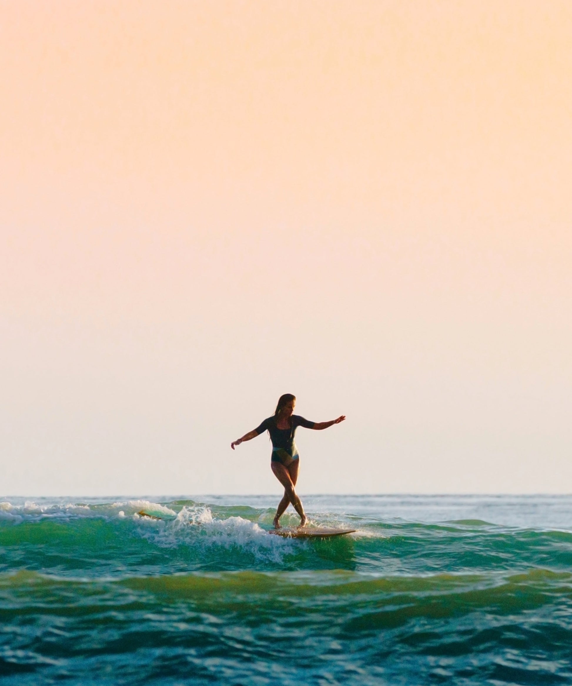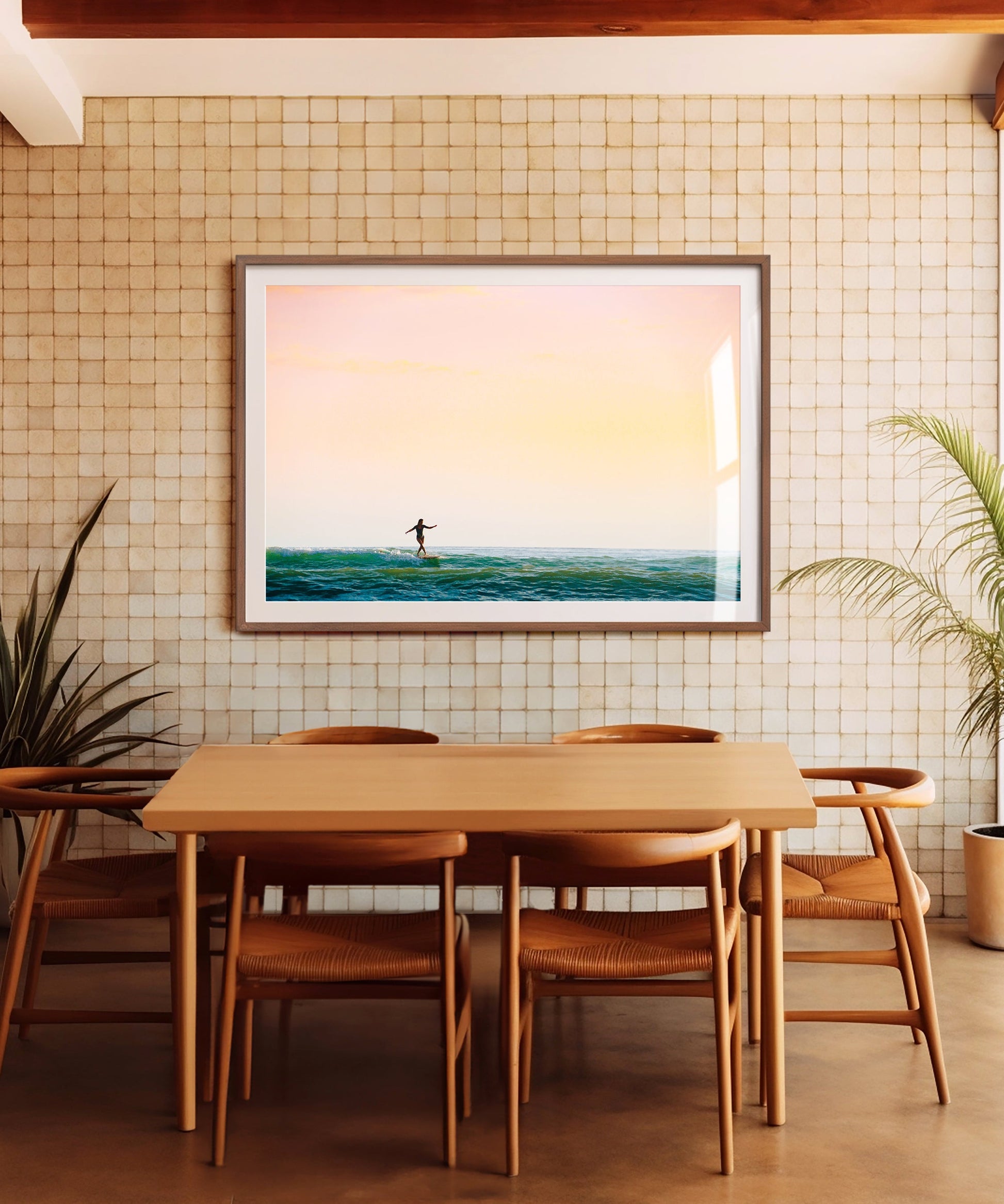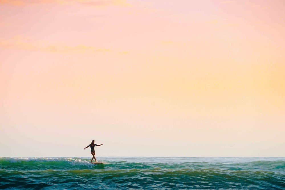 This piece is #2 in Ben Christensen's Surfing Sunsets Series, a collection of four striking photos that capture the serene moments during some of the final rides of the day. With its beautiful sky and blue waters, this piece is perfect for those wanting to add a calming, minimalist touch to their walls.