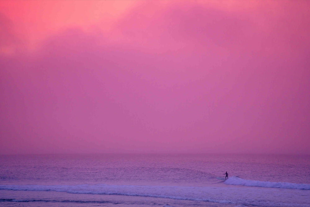 This piece is #3 in Ben Christensen's Surfing Sunsets Series, a collection of four striking photos that capture the serene moments during some of the final rides of the day. With its vivid pink skies and purple waters, this piece is perfect for anyone wanting to add a splash of color to their coastal space!
