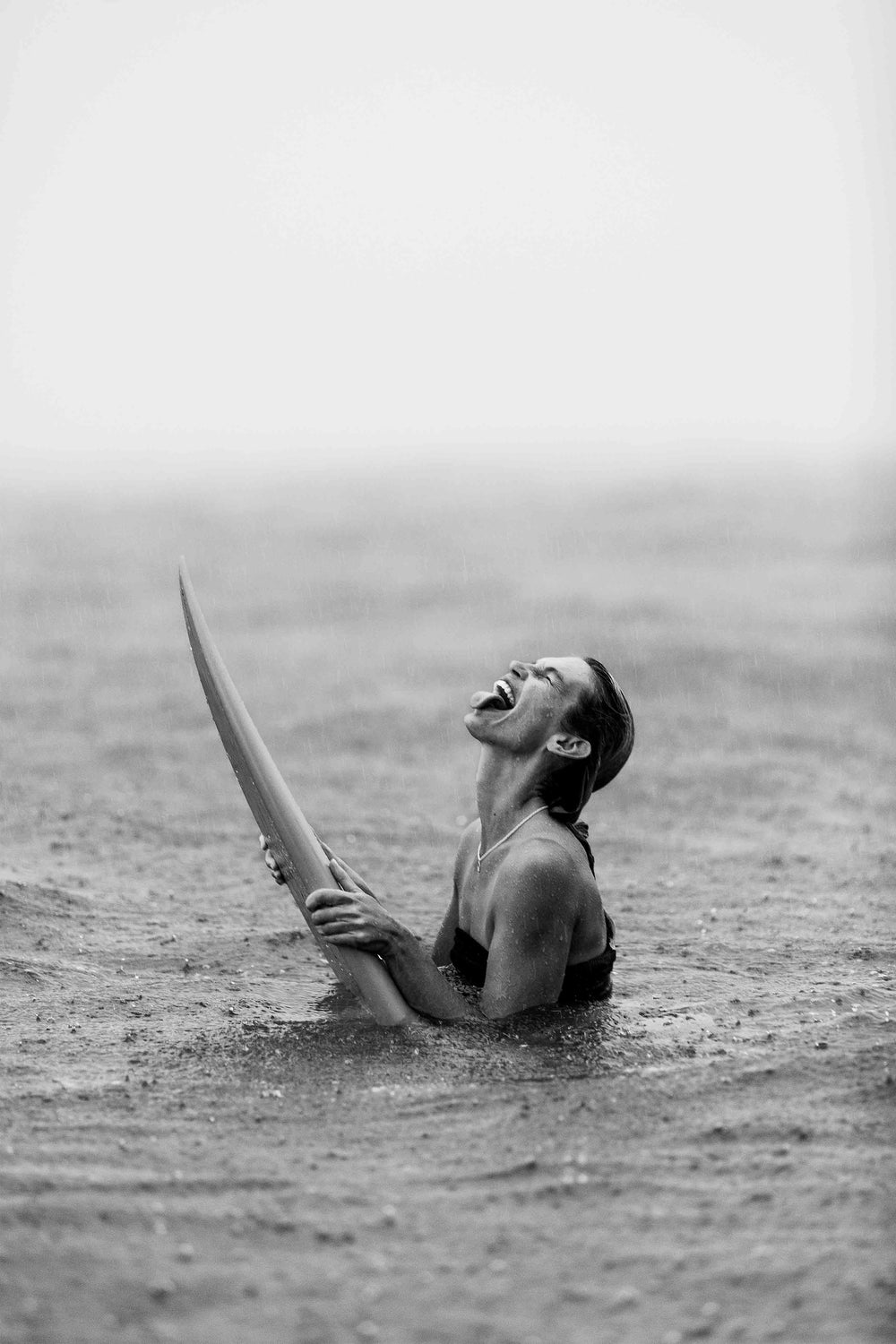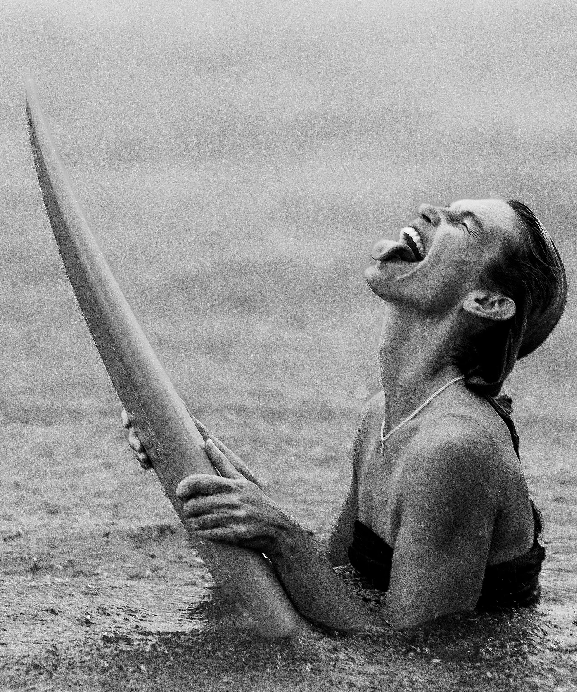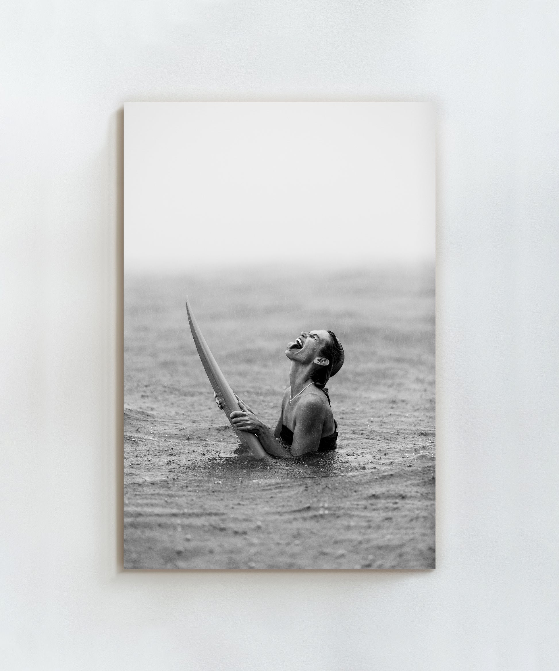 Not even the rain can ruin a perfect day in paradise. In this piece by Paula Ortega, a surfer embraces the downpour, leaning back on her board to taste the rain. Rendered in a striking black and white, Ortega is able to capture a moment that's raw and unfiltered. It makes a bold addition to your surf-inspired space, and acts as your daily reminder to never let anyone rain on your parade.