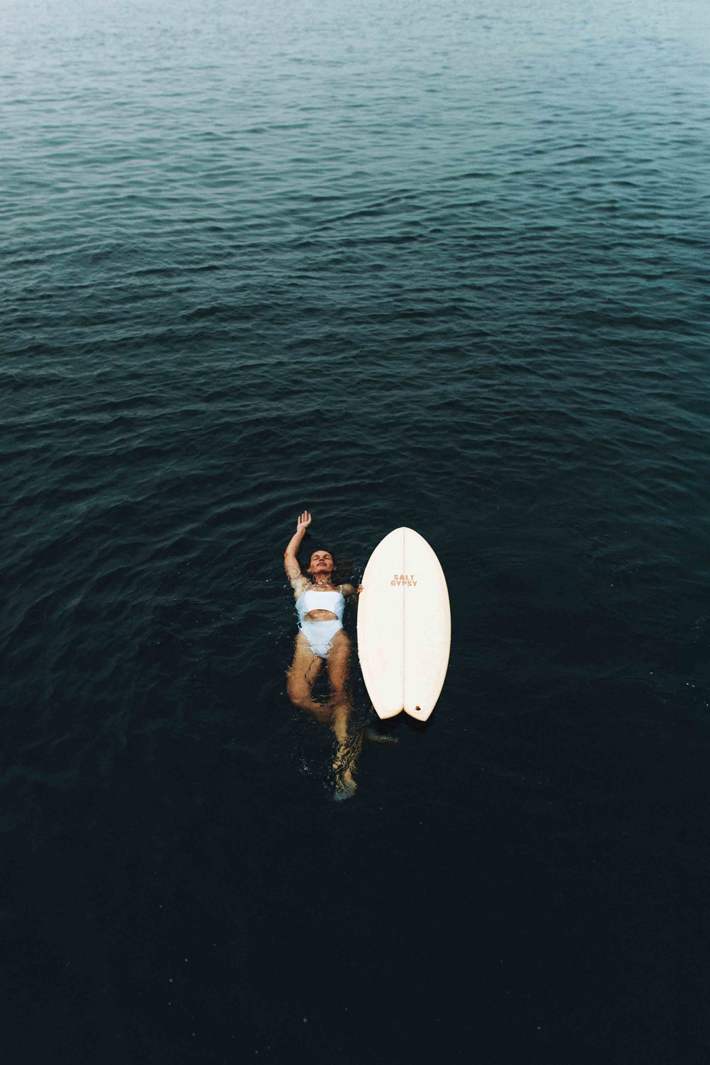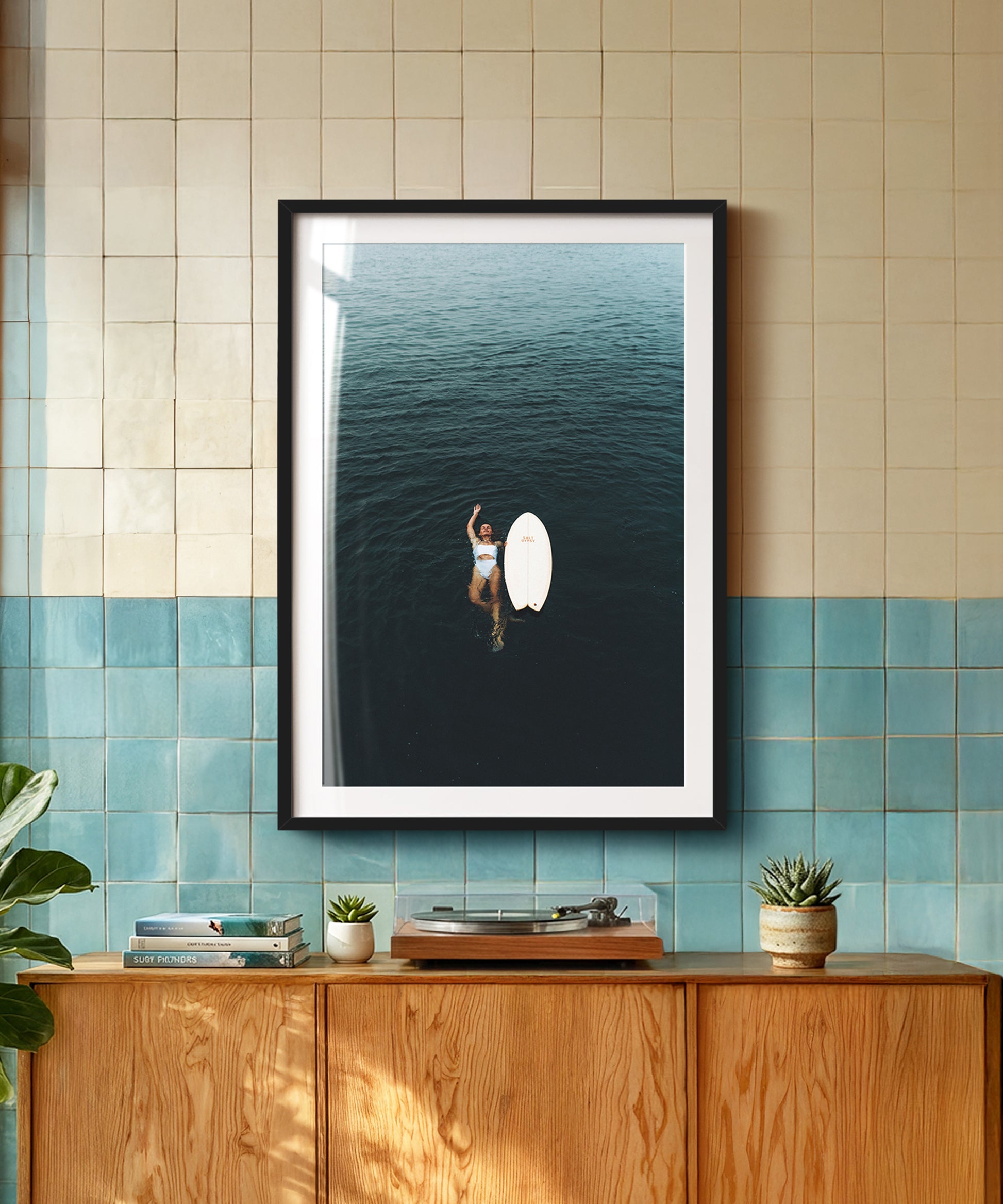 Weightless by Paula Ortega captures that suspended moment when time slows and worries drift away. Shot from above, a lone surfer floats effortlessly beside her board, drifting in open water as she waits for the next set. It's a piece that's quiet, expansive, and deeply calming, inviting you to linger a little longer in that in between space.